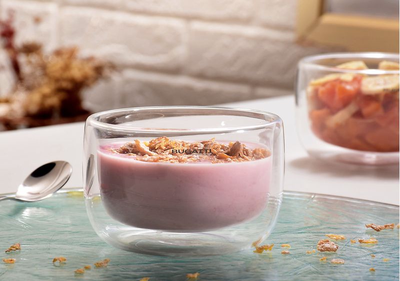 A tigela de sobremesa de parede dupla Bugatti é perfeita para transformar suas receitas em verdadeiras experiências visuais e sensoriais. Com um design moderno e sofisticado, a parede dupla cria um efeito flutuante incrível, valorizando ainda mais suas sobremesas. Produzidas em vidro borossilicato de alta qualidade, as tigelas são resistentes a variações de temperatura, ideais para servir tanto sobremesas geladas quanto preparações quentes, com total segurança e durabilidade. Com capacidade de 300ml, são ideais para servir sorvetes, mousses, frutas, açaí, cremes e muito mais, sempre com elegância e praticidade.