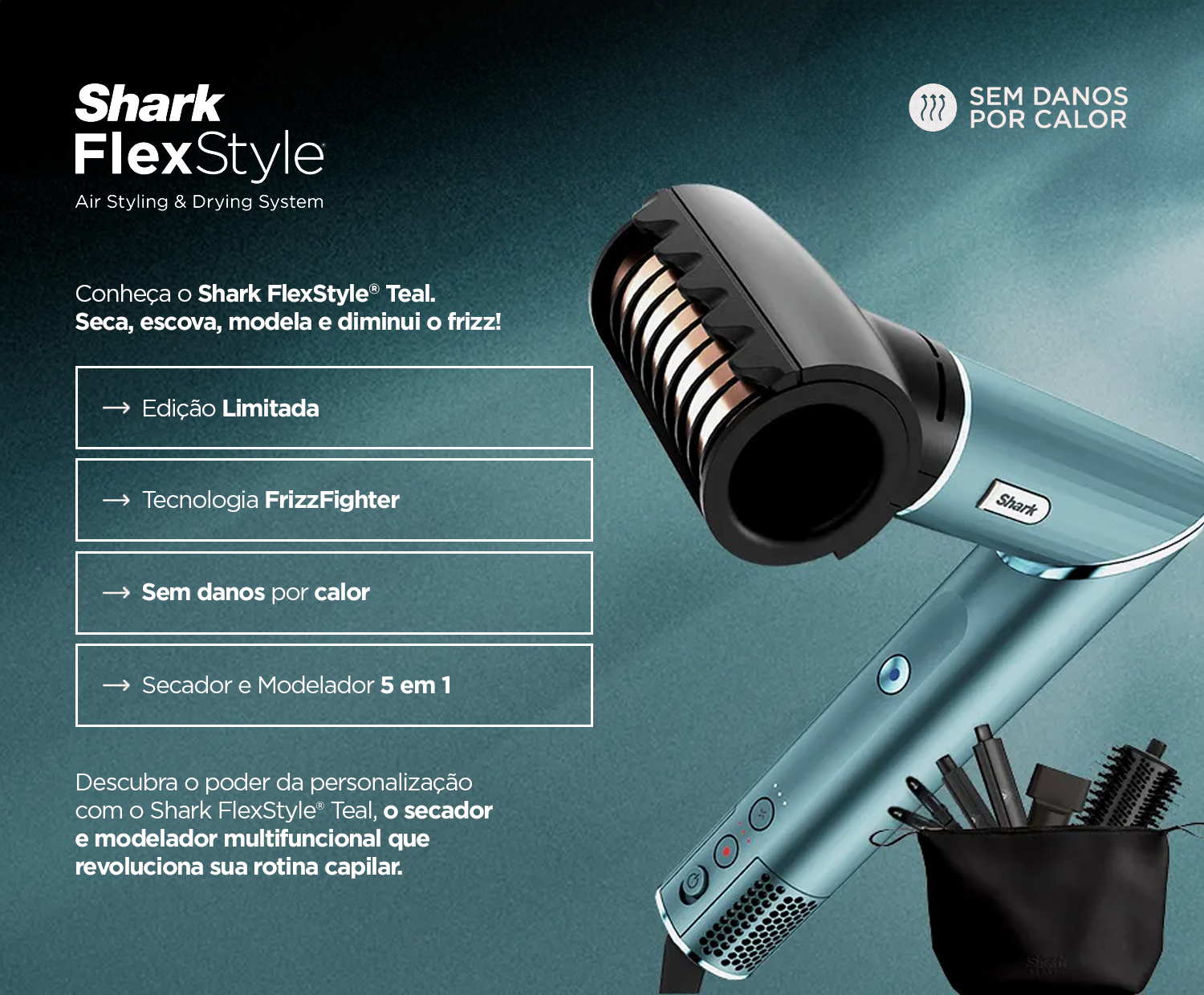 Secador e Modelador Multifunções 5 em 1 | Edição Limitada | Inclui FrizzFighter, escova oval, rolos de envoltura automáticos, nécessaire e presilhas. Descubra o poder da personalização com o Shark FlexStyle® Teal, o secador e modelador multifuncional que revoluciona sua rotina capilar.