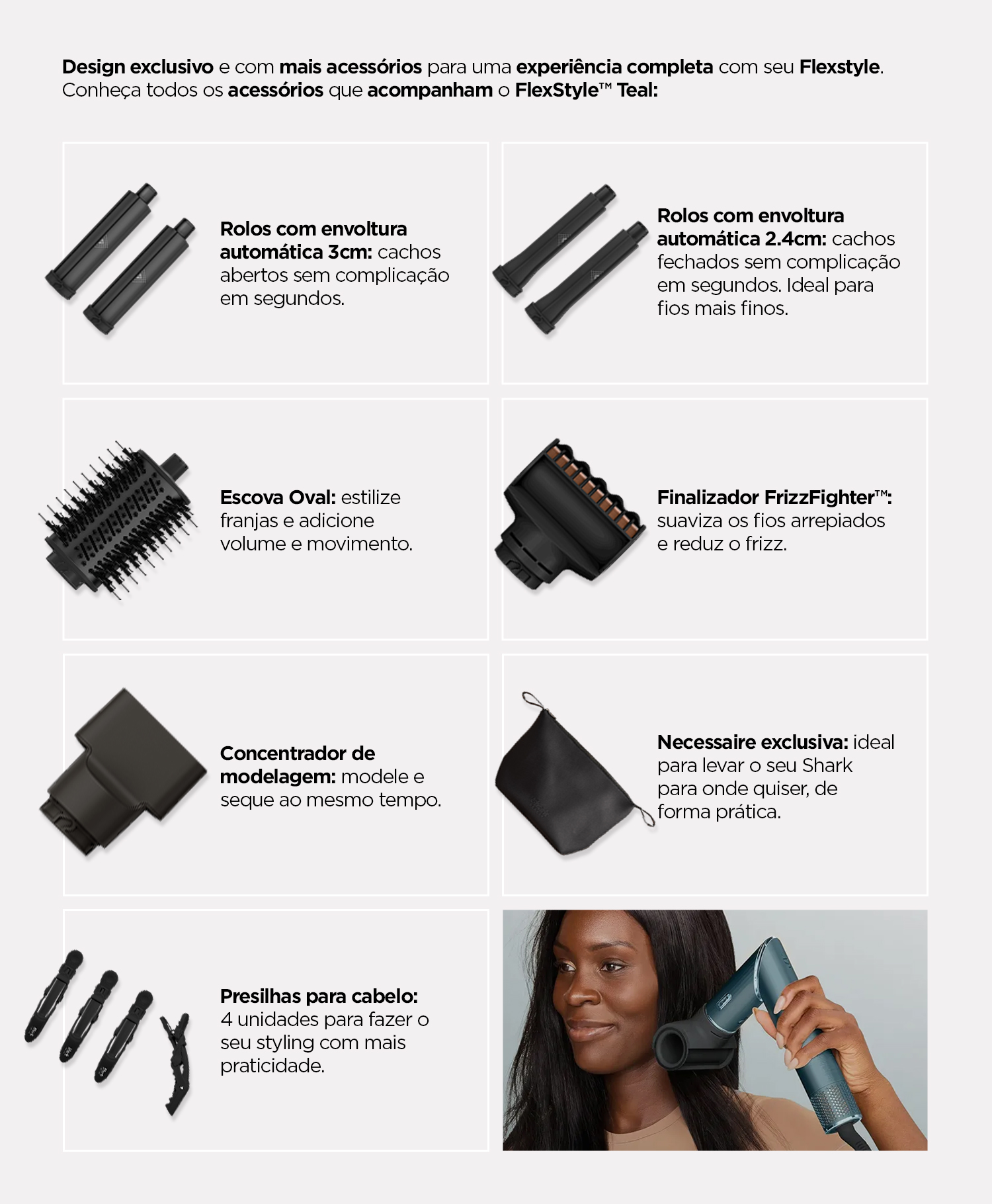 Tudo isso vem acompanhado de uma nécessaire personalizada Shark Beauty e presilhas para facilitar a modelagem, deixando seu espaço de beleza mais organizado e funcional. Ideal para todos os tipos de cabelo. Perfeito para quem quer resultado de salão em casa, com menos esforço e muito mais estilo.